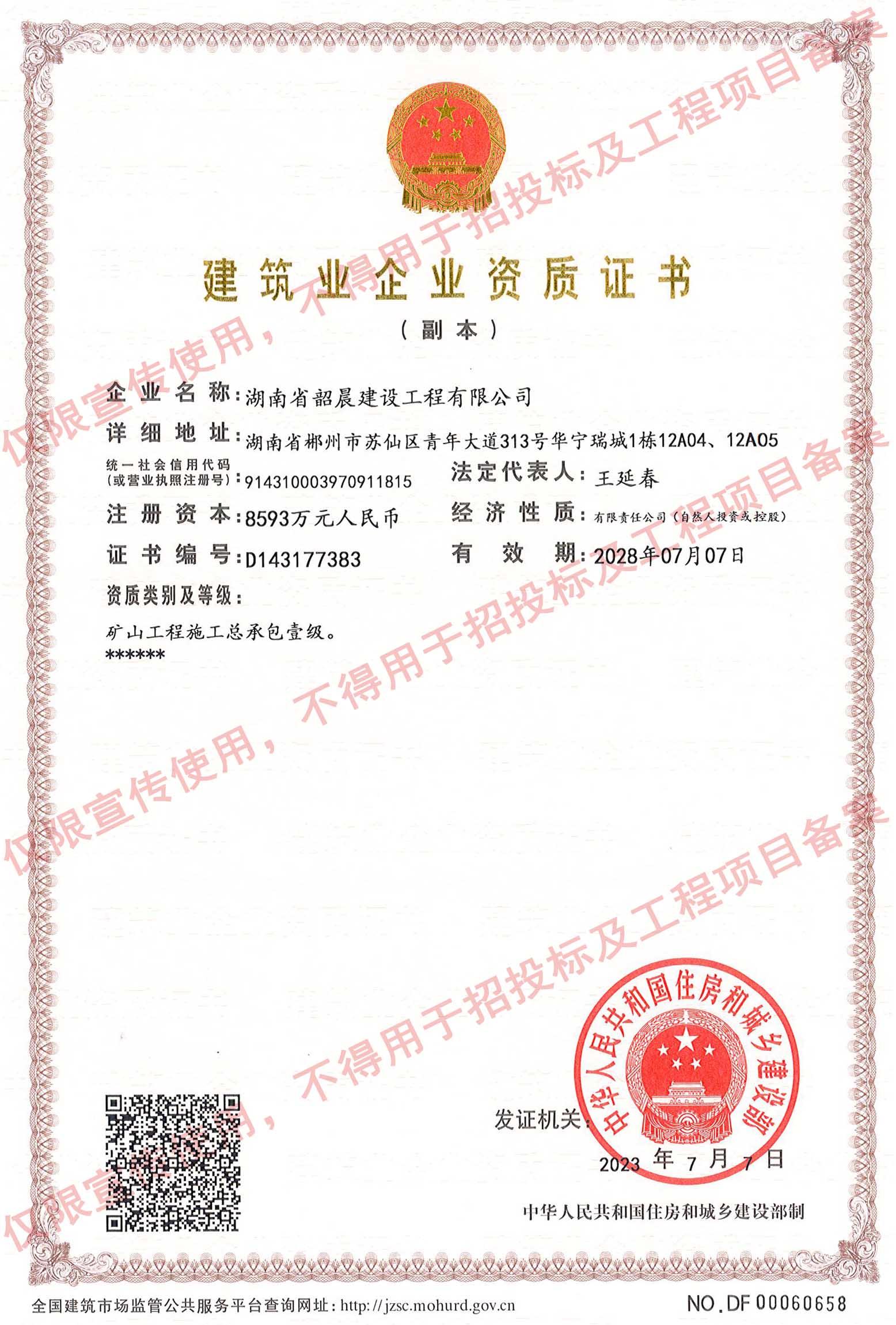 湖南省韶晨建設(shè)工程有限公司喜獲礦山施工總承包壹級資質(zhì)一路風(fēng)雨,十年磨一劍 湖南省韶晨建設(shè)工程有限公司喜獲礦山工程施工總承包壹級資質(zhì)